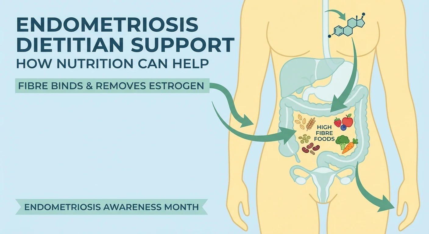 Fibre binds to estrogen in the gut and helps your body excrete it through the stool, which may support more balanced estrogen levels in estrogen‑driven conditions like endometriosis. A dietitian can help you gradually increase the right types of fibre (from wholegrains, fruit, veg and seeds) while managing bloating, diarrhoea or constipation so your symptoms don’t worsen.
